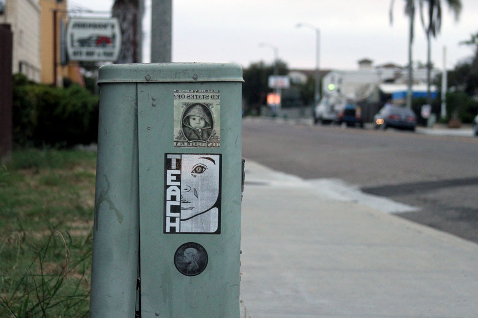 LA based street artist Teacher travelled down to Carlsbad for the event, and left some art of his own down there, including some sidewalk stencils, pastes and stickers. Great placement on the water one.