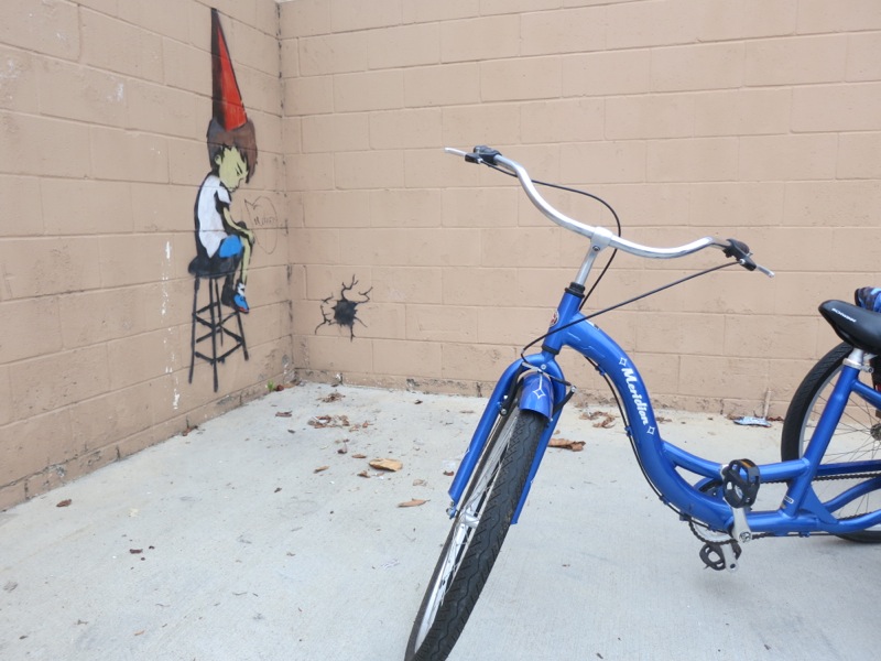 Like this here. Snyder placed his Dunce character at the perfect spot in a corner, in the heart of Carlsbad Village. Snyder's piece was not commissioned, but the property owners seem to enjoy it, and Dunce has been riding for months on end.