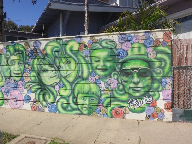 Jules Muck paints a series of faces in signature green along a home front wall in Venice Beach.